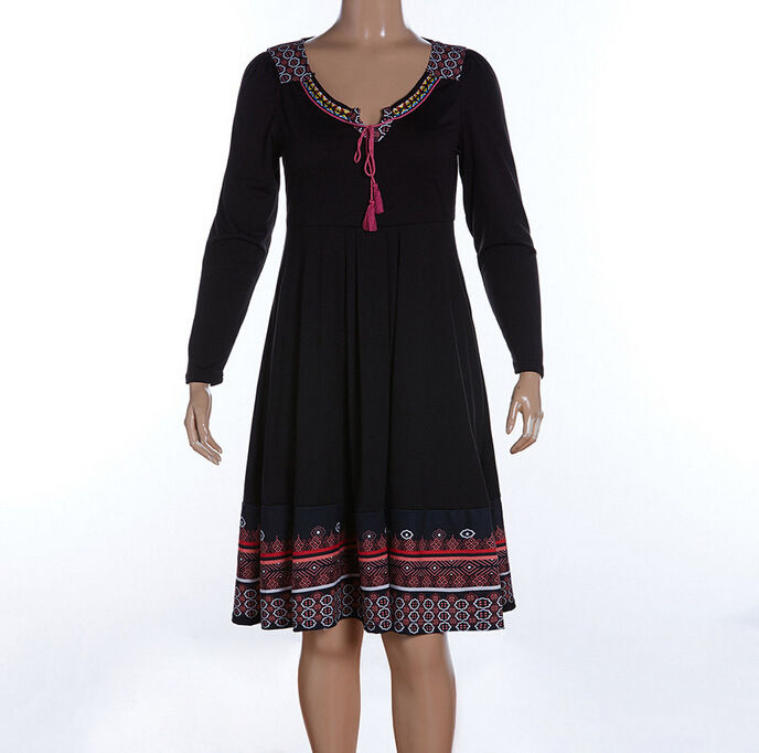 Black Plus Size Floral Causal Loose V Neck Long Sleeve Midi Dress