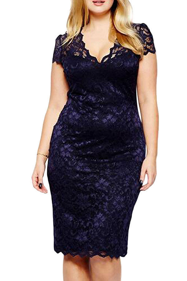 Summer V-neck Short Sleeve Lace Midi Party Work Pencil Dress Plus Size