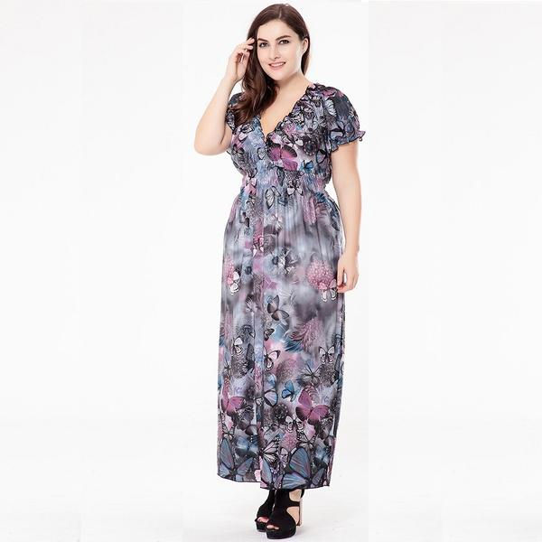 Plus Size Print Bohemian V Neck Maxi Long Summer Dress